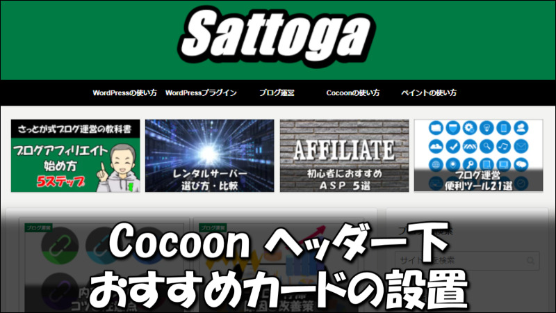 Cocoon設定の『おすすめカード』を利用すると、ヘッダー下に誘導したい記事のバナーリンクを設置できます。