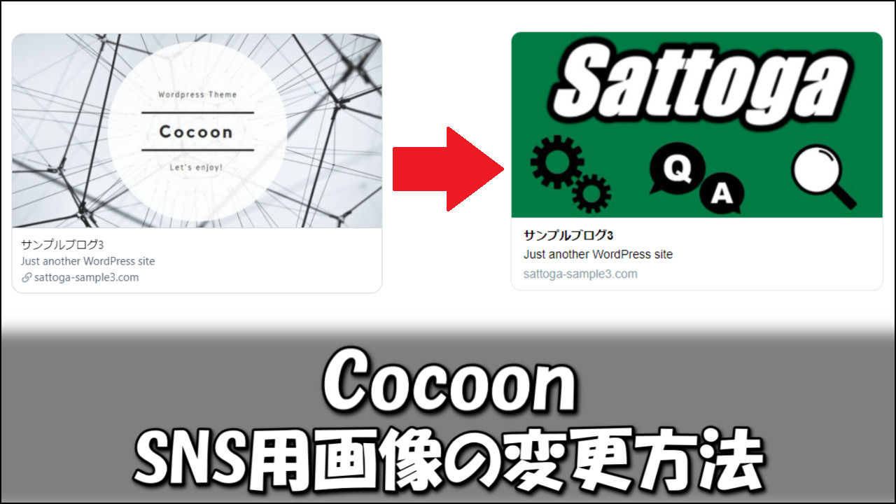 Cocoonを使っているブログのトップページのURL(例:https://sattoga.com/)をSNSに掲載すると、デフォルトではCocoonの画像が表示されます。