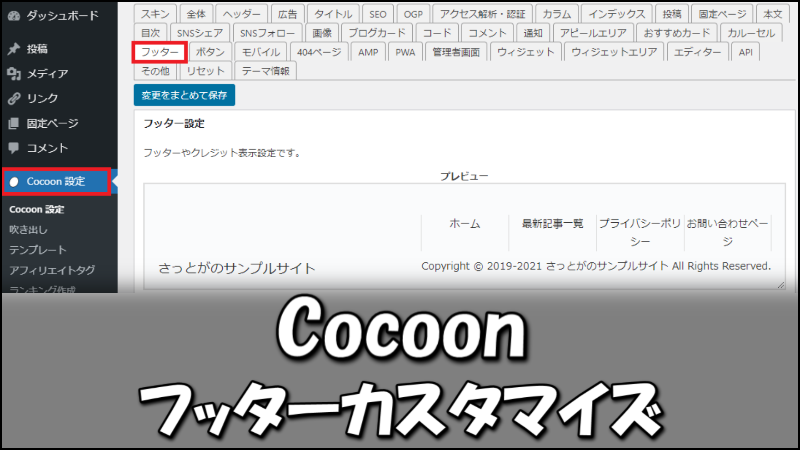 Cocoonの『フッター設定』では、フッターの色やクレジット表示などが設定できます。