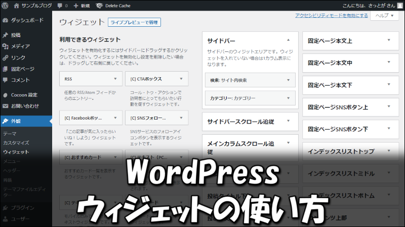 WordPressのウィジェットは、ブログのサイドバーやフッターなどに、最新記事一覧やカテゴリーなどのパーツを設置できる機能です。